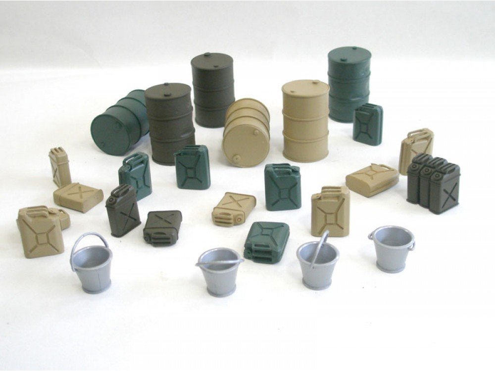In use, the DRUMS SET works across a wide range of military modeling themes. It fits perfectly into a garage or workshop vignette, adds credibility to a convoy halt scene, enhances a rear-area supply point, and brings realism to a checkpoint or outpost where stored materials are part of the environment. It also pairs well with tarps, pallets, crates, jerrycans, and tool sets, letting you build layered detail that looks intentional rather than randomly placed. For photographers, these drums help create foreground and midground elements that improve composition and scale perception in close-up shots.