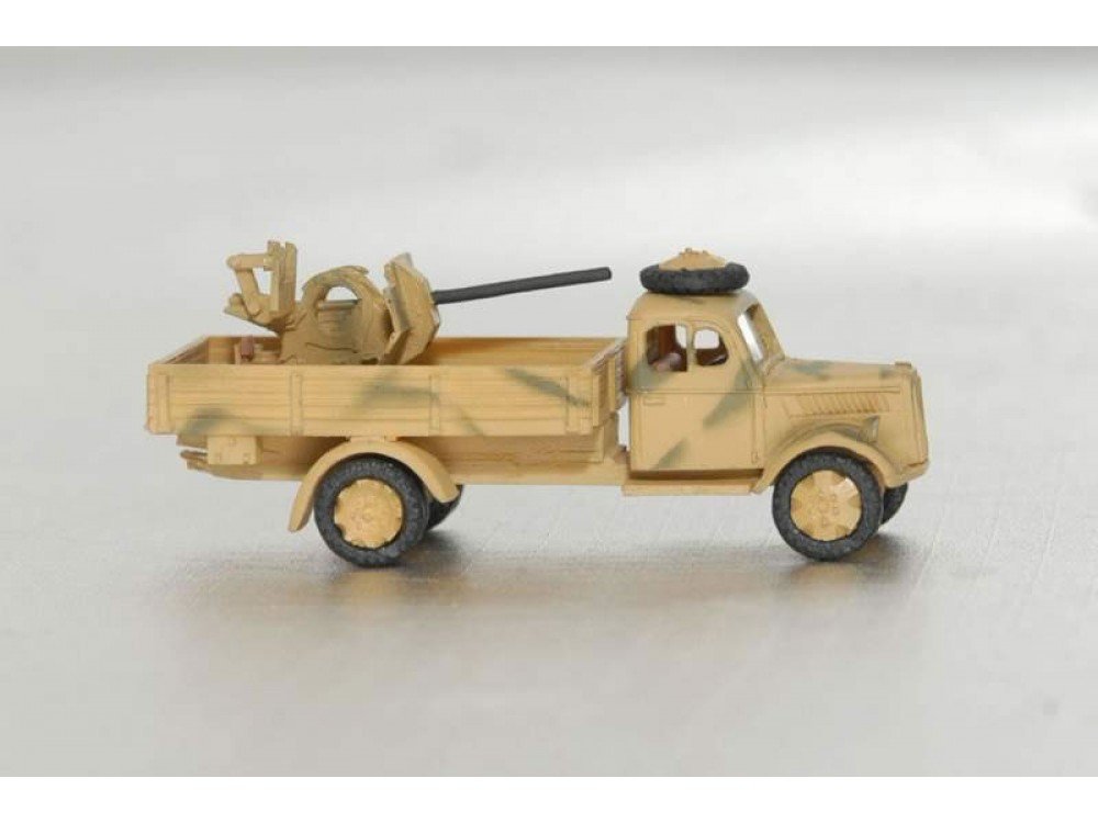 This is a strong choice for several use cases. For dioramas, it can serve as the centerpiece of a defensive roadside vignette, a convoy halt, or a depot perimeter scene. For collectors, it offers variety compared to standard cargo or troop-transport configurations, adding a more specialized variant without abandoning the core Opel Blitz identity. For layout builders, it provides a ready-made “story tool”: park it near an industrial facility to imply asset protection, place it by a bridge to suggest strategic security, or stage it near rail loading areas to connect road logistics with rail operations.