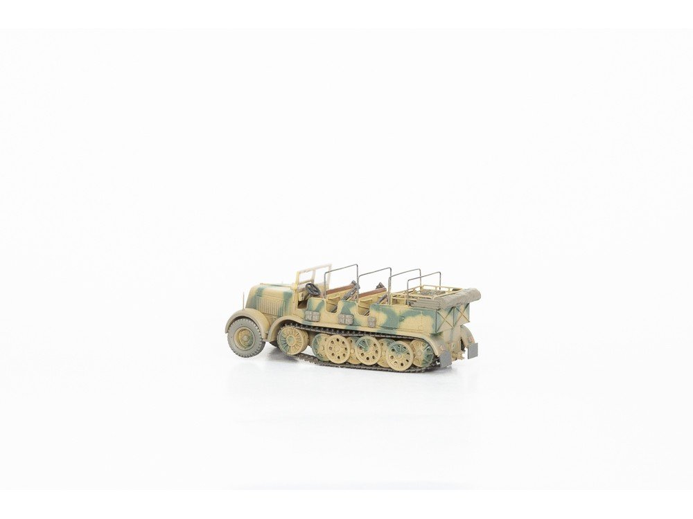 Use-case flexibility is where this model earns its keep. Place the Sd Kfz 8 DB10 in a railhead or depot scene to suggest heavy unloading and preparation. Set it near artillery or engineering equipment to imply towing and positioning capability. Integrate it into a convoy to break up repeating silhouettes and make the lineup feel like an organized unit rather than a collection of similar trucks. In a workshop or maintenance vignette, it can act as the “big machine” that explains why a facility exists at all. And if your focus is purely display, it still functions as a centerpiece support vehicle—something that looks purposeful next to armor, rail stock, or field infrastructure.
